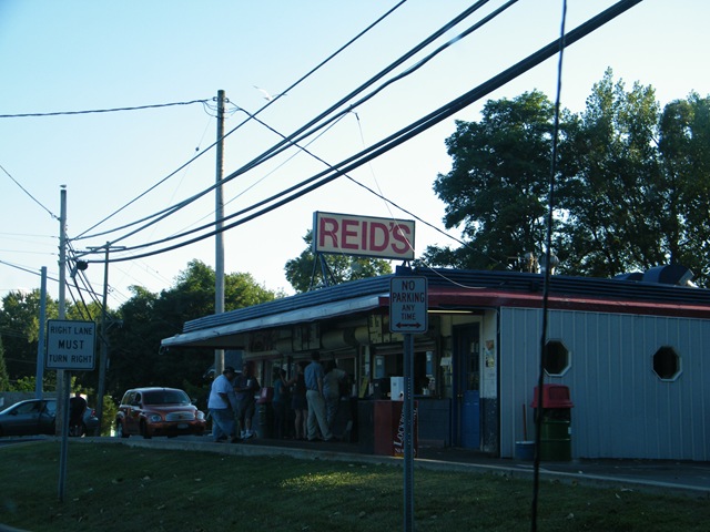 stand and was a little confused. Sure, I could figured out what a Shake was or that “Hamburg” means “Hamburger” and “Cheeseburg” means “Cheeseburg” I figured all the ones with “Hot” in them were hot dogs but what’s the difference between a “Red Hot”, a “White Hot”, or a “Hot Ham”? And did I want the special “Reid’s” sauce… I have no clue. I ended up ordering a Red Hot with fries and a strawberry shake which the cashier called back to the cooks as a “Red Fry Straw”. Mark got some extra onion rings with the special sauce so I could try it too. It was pretty good and as he said… quite the experience… complete with pigeons and everything.