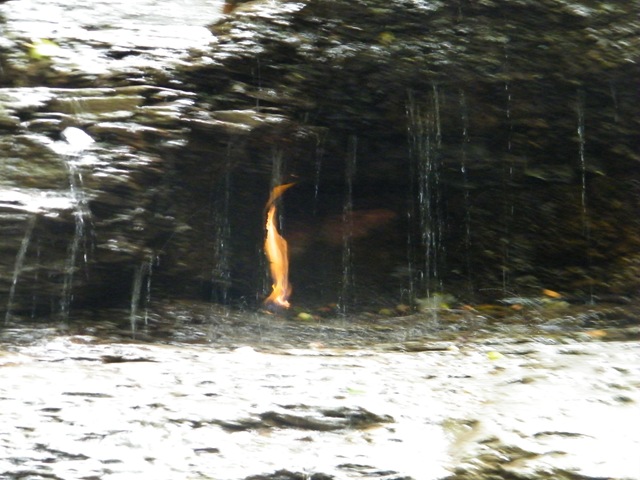Natural gas comes up in the rocks behind a waterfall and someone lit it at one point.