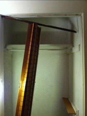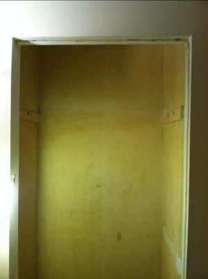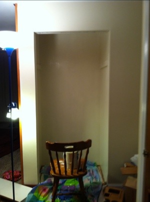 After trying countless ways to clean cat hair off of velvet wallpaper that lined the closet, I decided it had to come out, and the hooks and the shelves and the door.