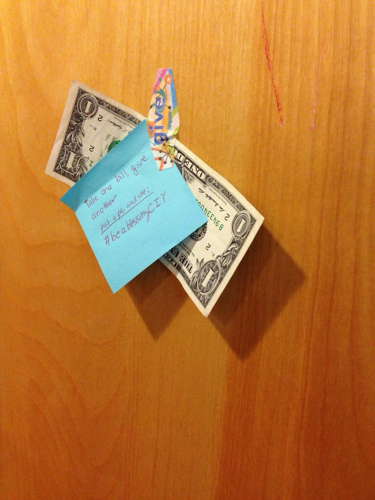 – A group of girls wanted to just have some fun around campus with some of their money, so they went around leaving dollar bills on vending machines, in elevators, on doors and more. While waiting for the doors to open for evening program, we even started a game of picking a random name, walking around the crowd yelling it until we found someone with that name and then just handed them a dollar and walked away. The reactions were priceless and was one little way to make people’s day.
