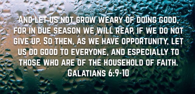 “And let us not grow weary of doing good, for in due season we will reap, if we do not give up. So then, as we have opportunity, let us do good to everyone, and especially to those who are of the household of faith.” (Galatians 6:9-10)