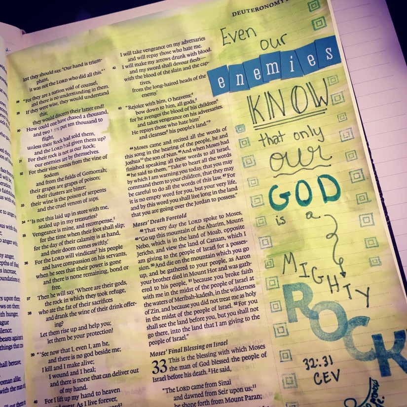 I struggled to write this week’s blog reflection just because there were so many words, phrases, and themes that jumped off the page for me. I lost count of the times God talked about fighting for his people or reminded them/us that we don’t need to be afraid. I also read a lot of this book in a new translation (CEV) that I hadn’t read it in before which made new things stand out. One of those verses was near the end of the chapter in Moses’ song: