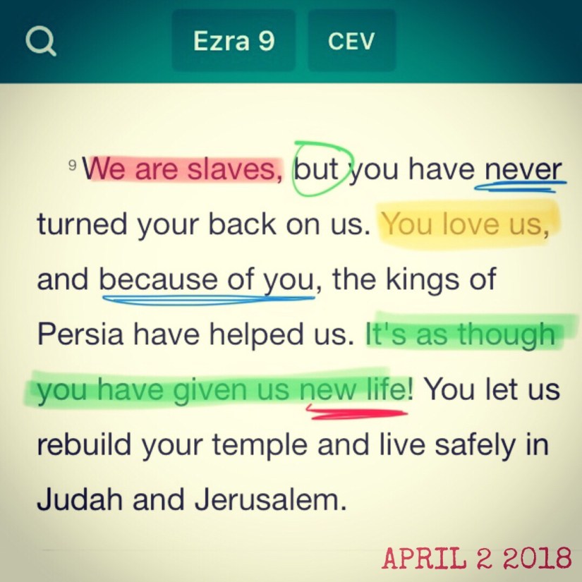 “We are slaves, but you have never turned your back on us. You love us, and because of you, the kings of Persia have helped us. It’s as though you have given us new life! You let us rebuild your temple and live safely in Judah and Jerusalem.” (Ezra 9:9)