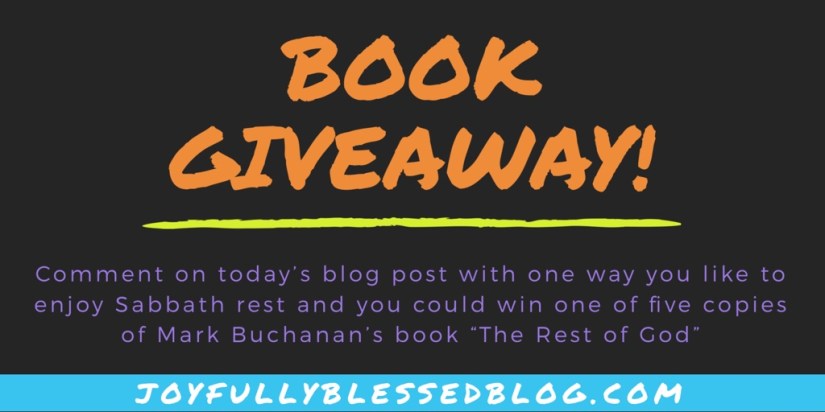 All you have to do is leave a comment on the blog with one way you enjoy the rest of Sabbath (or wish that you would make time to enjoy). Five comments with be randomly selected tomorrow morning. Entries end at midnight (Eastern time).